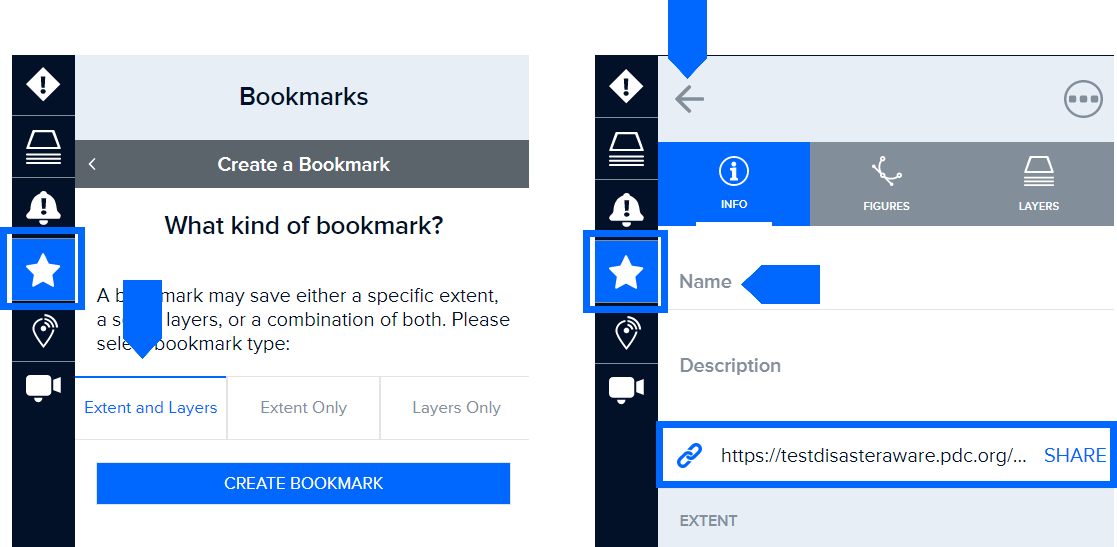 Click the Info icon to the right of the bookmark name in your bookmarks list to copy/paste the bookmark link. This icon also provides helpful information about the map extend, layers activated, and when the bookmark was created.
