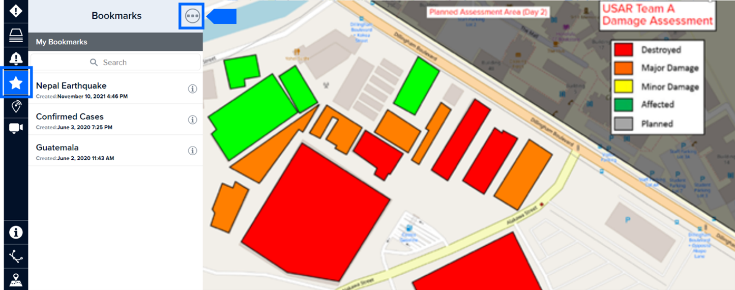 To view your list of bookmarks, edit the name of a bookmark, delete or export a bookmark, or to locate the URL of a bookmark you’ve already created, click the Bookmark icon on the left toolbar to view your list of bookmarks.