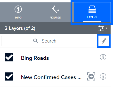 You can add or change Layers in an existing bookmark. Click the Info icon next to the bookmark you want to edit. While in the Bookmarks panel, click the Layers tab and then the Edit icon as shown below. |