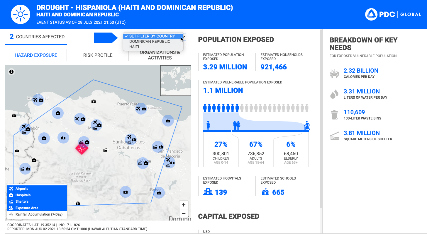 By default, Event Brief displays estimates for the entire geographic area affected by a hazard. If there is more than one country affected by a hazard, you can filter information based on single country. Click the Set Filter by Country dropdown.