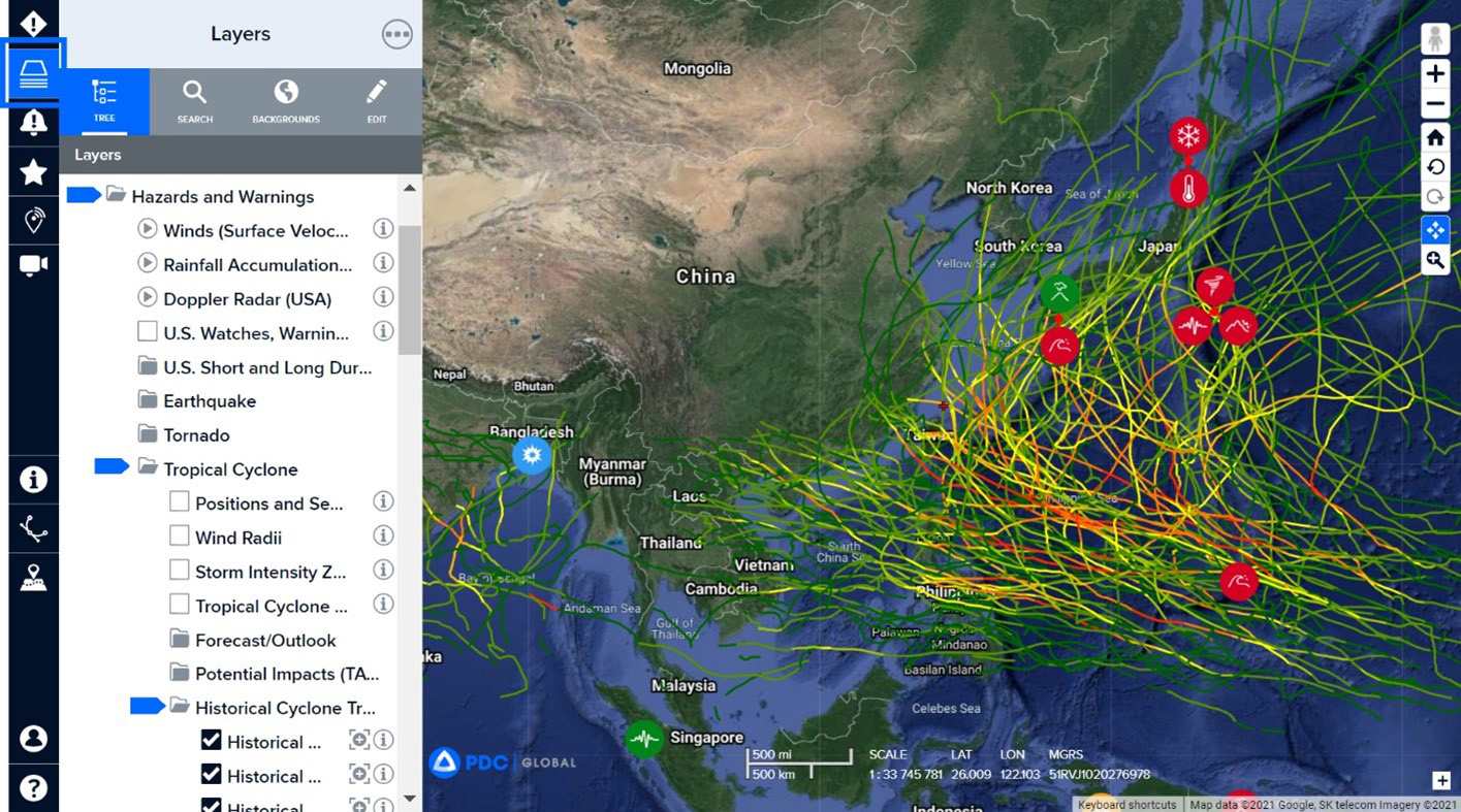 PDC stores data layers specific to major disasters for which it is providing support in the Disaster Response Events folder. This folder includes active and historical response events with information about hazard zones and impacts contributed by the international response community.