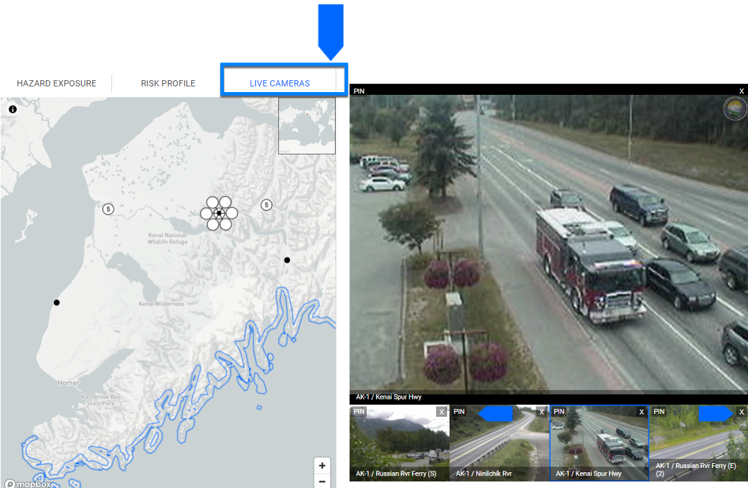 To get a picture of what is happening on-the-ground, select the Live Cameras tab. You may see black points on the map which represent individual camera locations. Numbered points indicate clusters of cameras.
