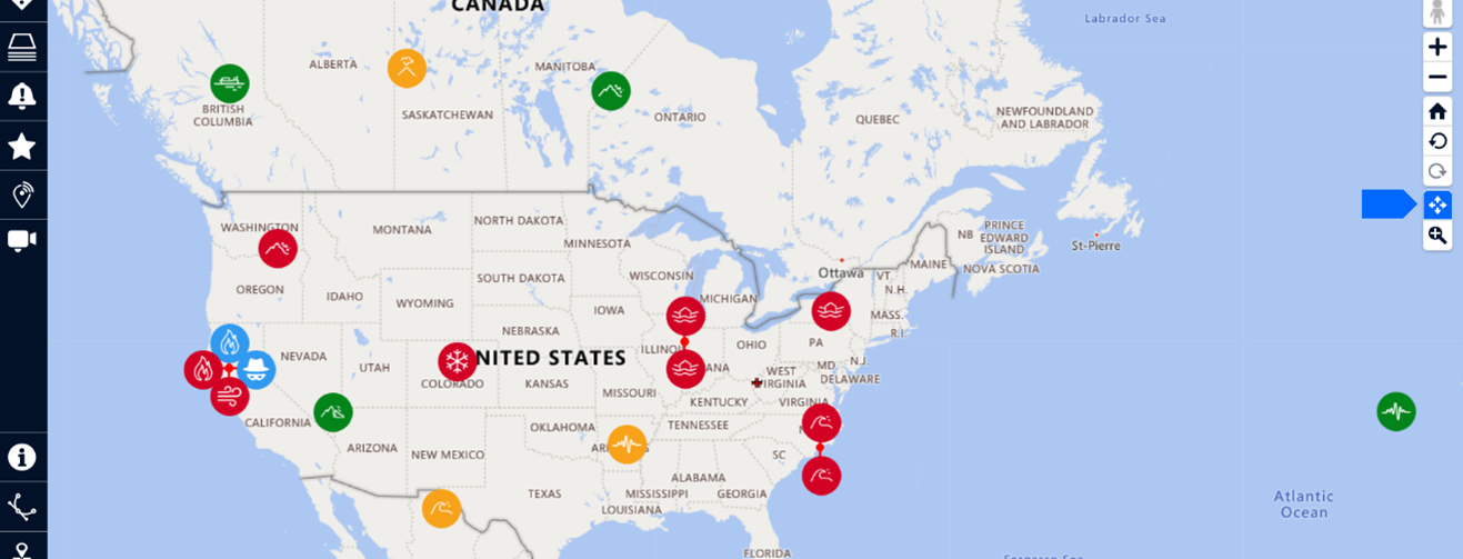 This method is commonly used and allows you to quickly locate and select a hazard directly from the map. Place your cursor over the map and then click and drag your mouse to pan the map and look for hazards. Make sure the pan tool is highlighted on the left toolbar when trying to pan the map. See the section on Map Navigation Basics for more on this.