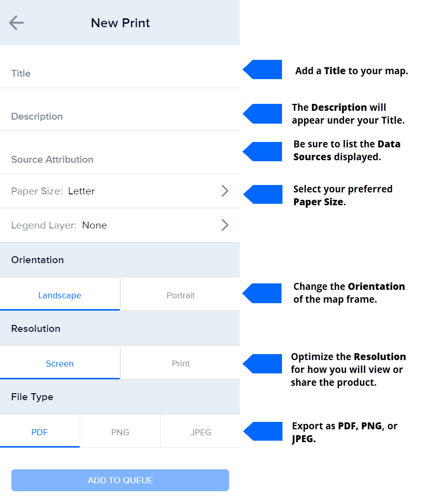 Once you have entered your print details as described above, you can now download your print. Within the same Print panel, select the Add to Queue button as depicted in the screenshot above.