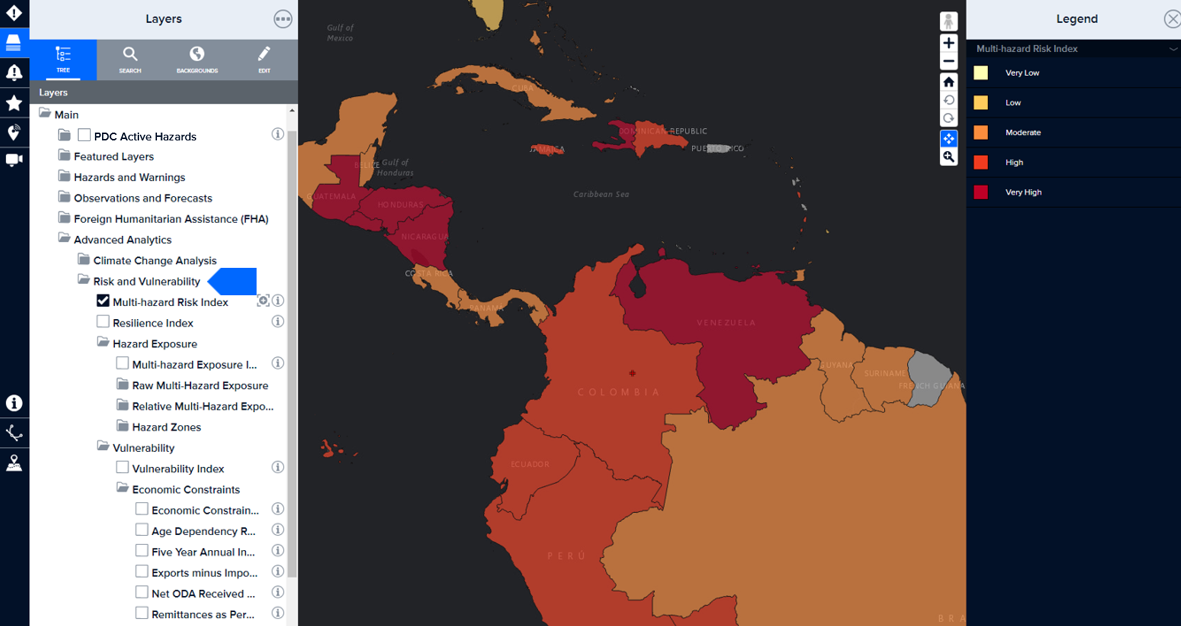 Scroll down to the Advanced Analytics folder and open the Risk and Vulnerability folder. You can view a national comparison of overall multi-hazard risk. Expand the folder to drill deeper to inspect the national indicators of risk that contribute to the overall score. |
