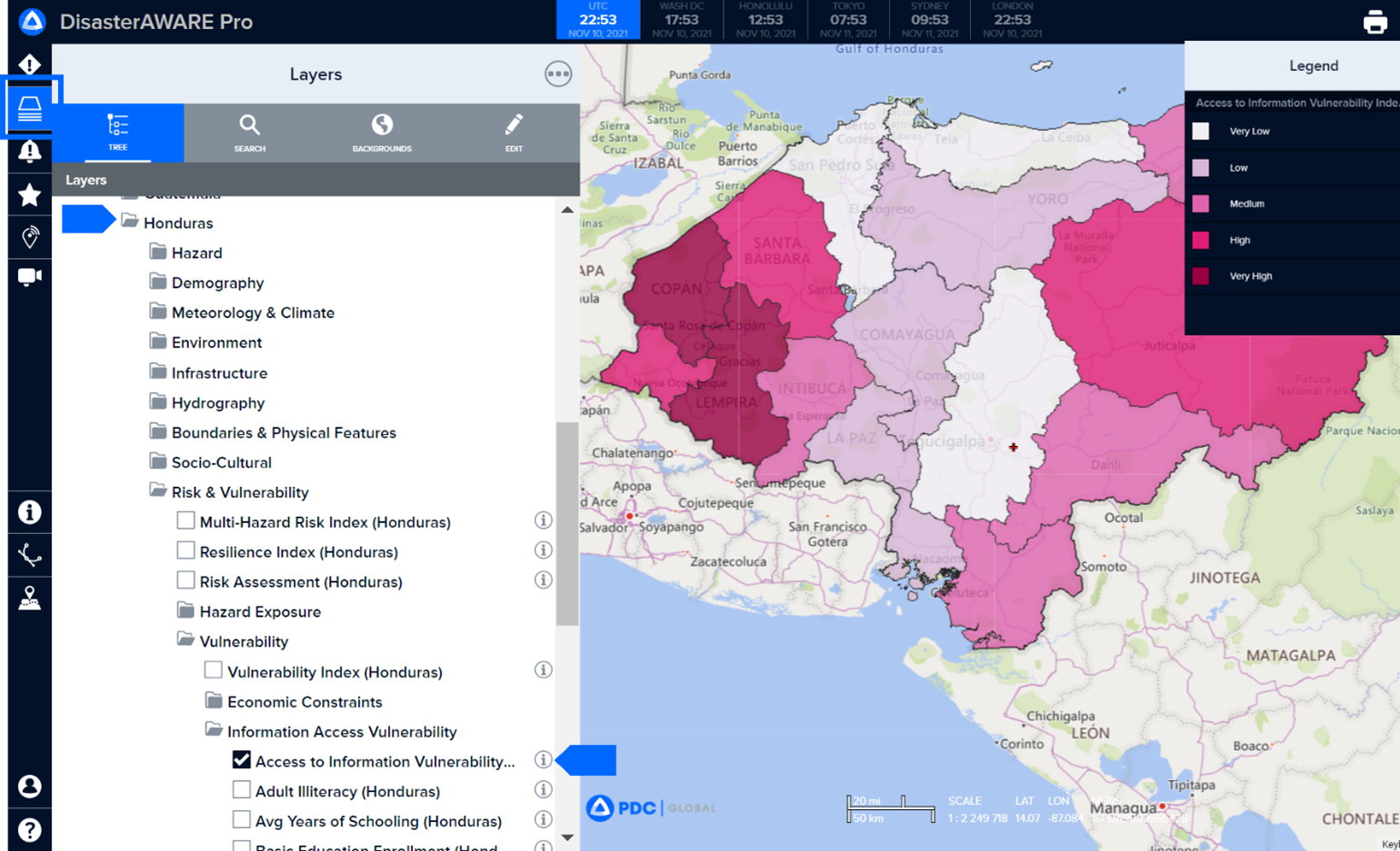 Effective decision making requires a comprehensive understanding of disaster risk in order to protect lives, livelihoods, property, critical lifelines, and social and economic vitality. DisasterAWARE provides you with access to PDC’s global Risk and Vulnerability Assessment (RVA) information at the national level for over 190 countries, and subnational RVA information for select countries.